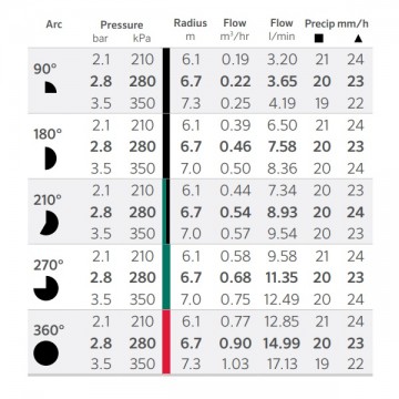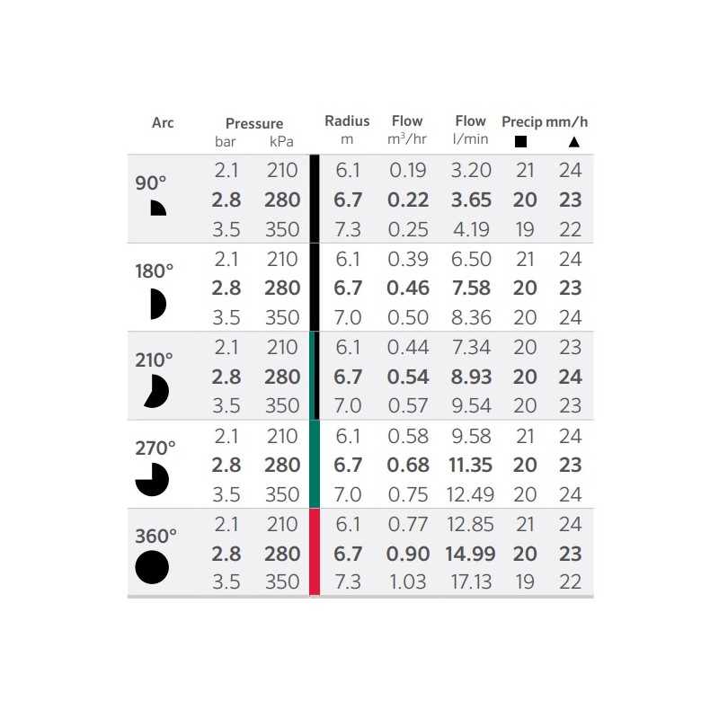 Minden Rotátor fúvókának egyedi színkódja van a könnyebb beazonosíthatóság miatt. Ezzel együtt a fúvóka tetején megtalálhatja a típusszámot és a szögbeállítás intervallumát is. A többsugaras fúvóka lassú intenzítással, jobban és egyenletesebben öntöz, még szeles időjárásban is.