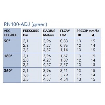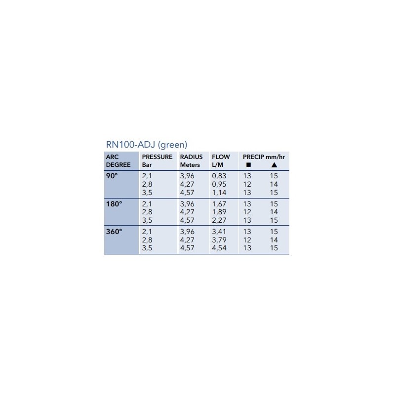 Minden Rotátor fúvókának egyedi színkódja van a könnyebb beazonosíthatóság miatt. Ezzel együtt a fúvóka tetején megtalálhatja a típusszámot és a szögbeállítás intervallumát is. A többsugaras fúvóka lassú intenzitással, jobban és egyenletesebben öntöz, még szeles időjárásban is.