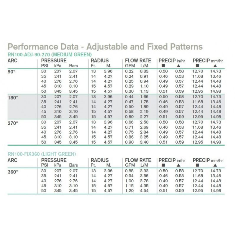 Minden Rotátor fúvókának egyedi színkódja van a könnyebb beazonosíthatóság miatt. Ezzel együtt a fúvóka tetején megtalálhatja a típusszámot és a szögbeállítás intervallumát is. A többsugaras fúvóka lassú intenzitással, jobban és egyenletesebben öntöz, még szeles időjárásban is.