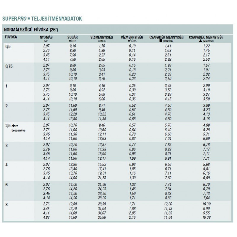 - Ajánlott szórófej osztásköz: 8,5m - 13,4m