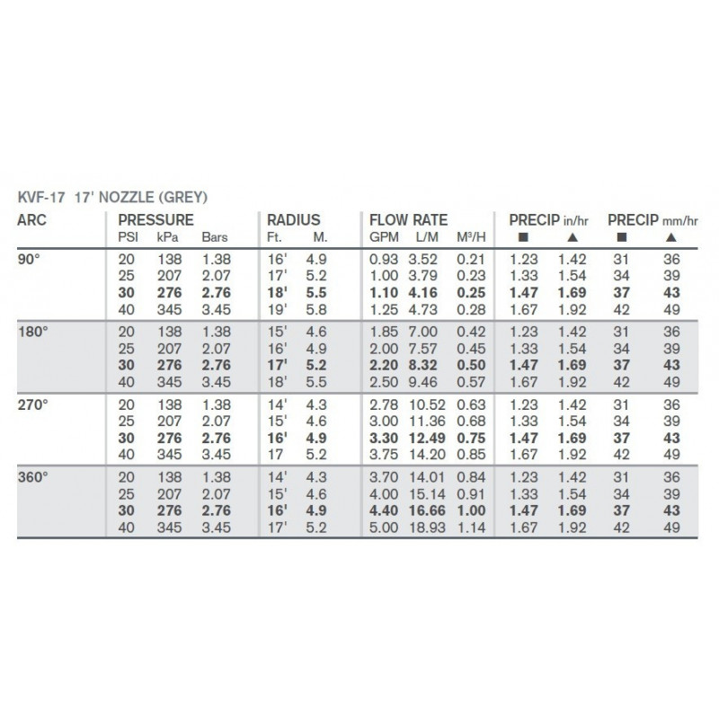 Mindegyik KVF HE Spray fúvókának egyedi színkódja van a könnyebb beazonosíthatóság miatt. Ezzel együtt a fúvóka tetején megtalálhatja az öntözési távolságára vonatkozó számot is. Az esőztető spray fúvóka közepes intenzitással és egyenletesen öntöz, még mérsékelten szeles időjárásban is.