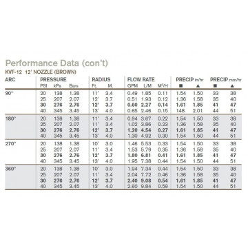 Mindegyik KVF HE Spray fúvókának egyedi színkódja van a könnyebb beazonosíthatóság miatt. Ezzel együtt a fúvóka tetején megtalálhatja az öntözési távolságára vonatkozó számot is. Az esőztető spray fúvóka közepes intenzitással és egyenletesen öntöz, még mérsékelten szeles időjárásban is.